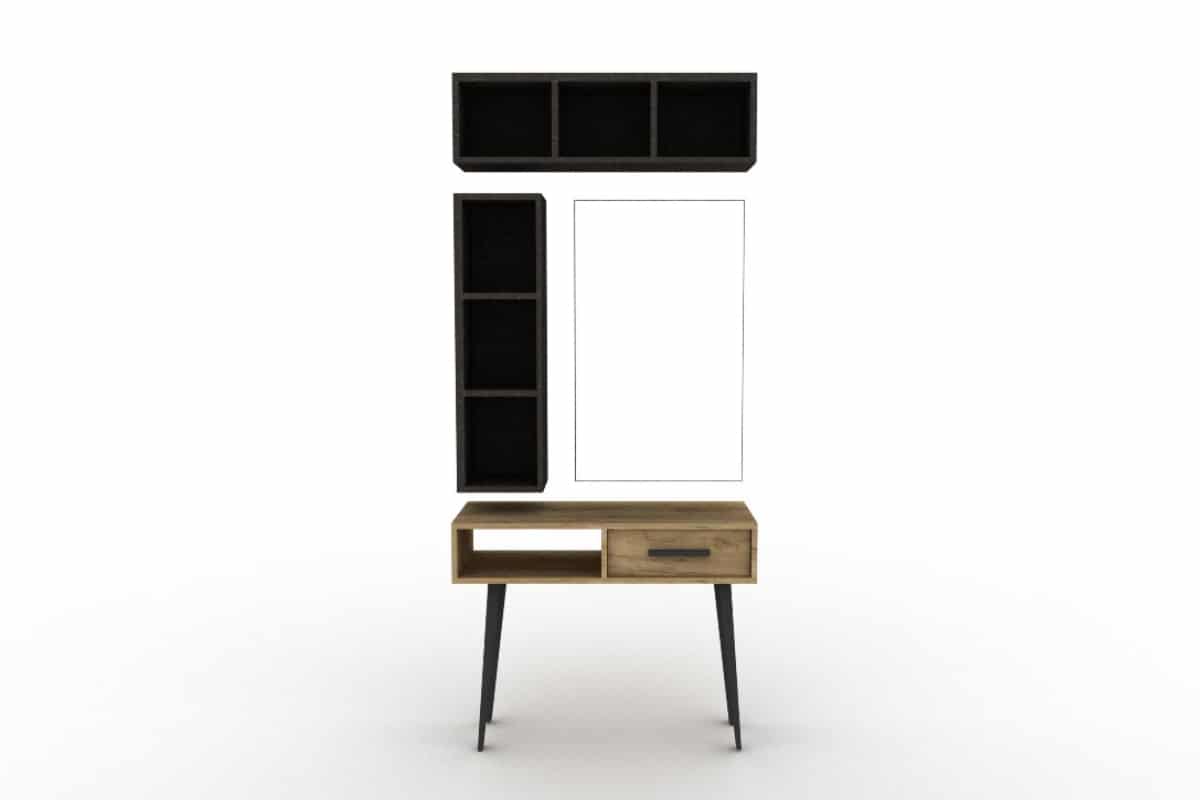 Το έπιπλο εισόδου SIXTIES αποτελείται από την κονσόλα με το ένα συρτάρι και το κενό , από τις δύο εταζέρες και τον καθρέπτη .
