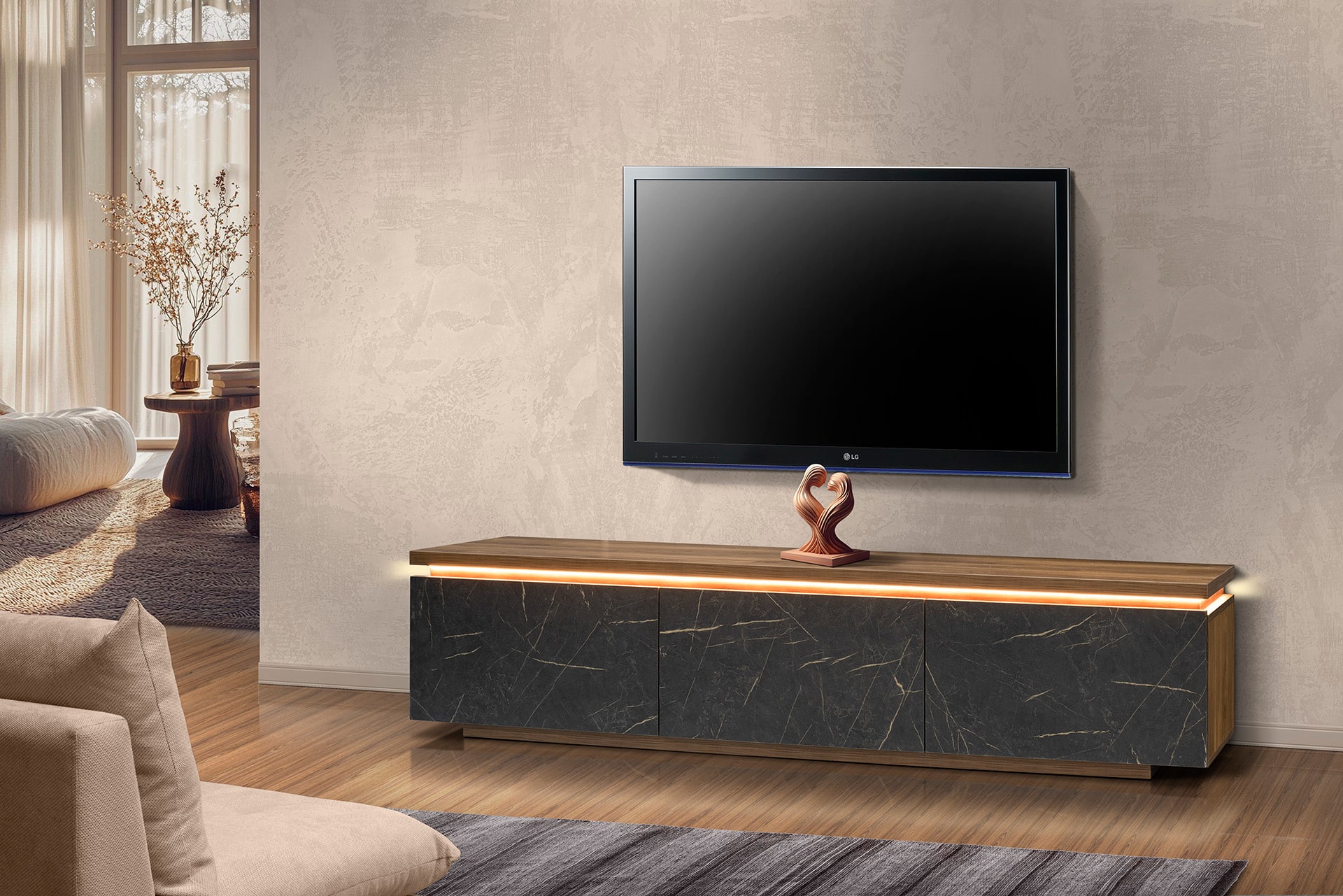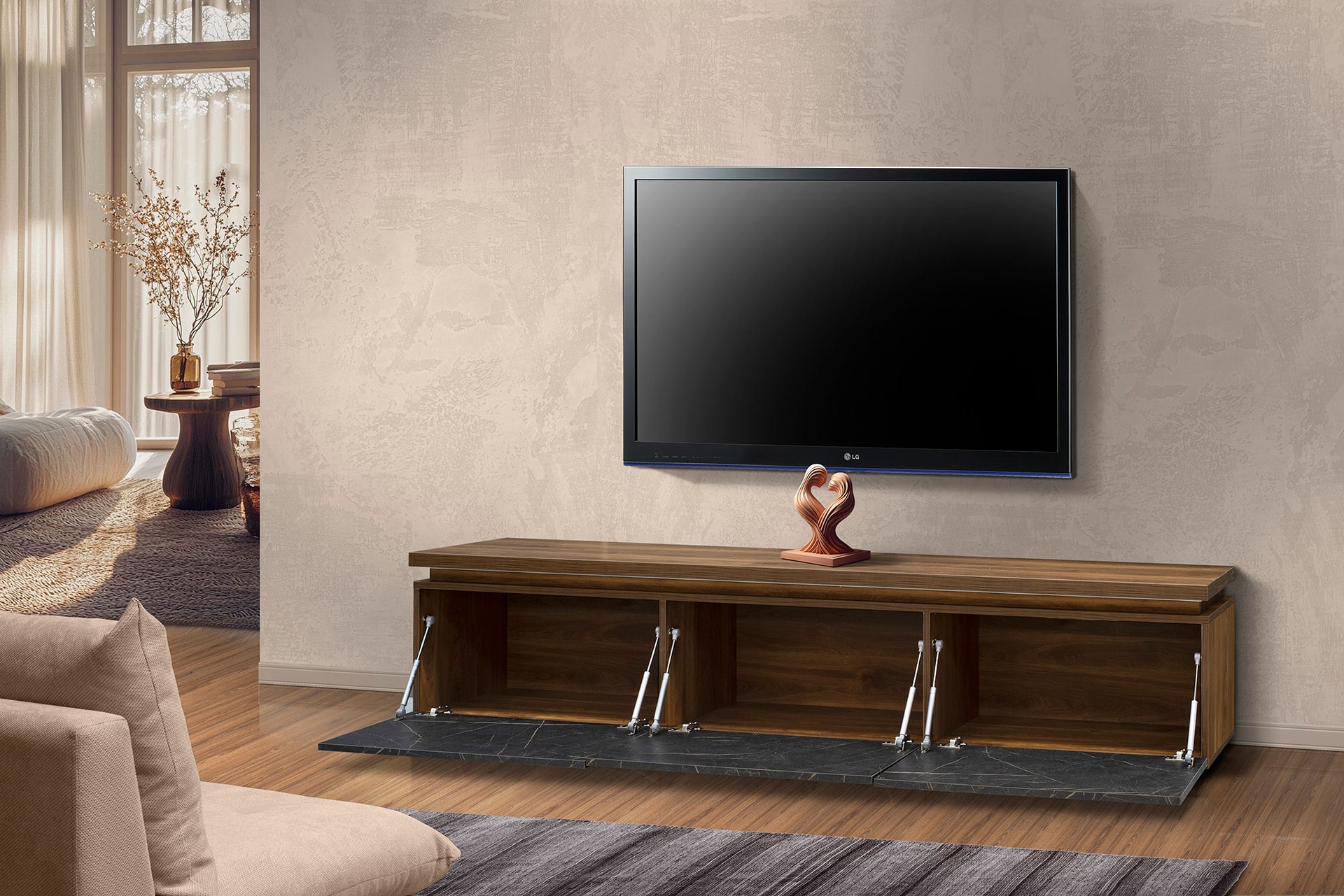 Το έπιπλο tv HORIZON μπορείτε να το επιλέξετε με led ή χωρίς . Οι τρεις μεγάλες μπαρόπορτες , επιτρέπουν την αποθήκευση πολλών αντικειμένων . Αποτελεί ουσιαστικά το κάτω τμήμα της ομώνυμης επιπλοσύνθεσης.