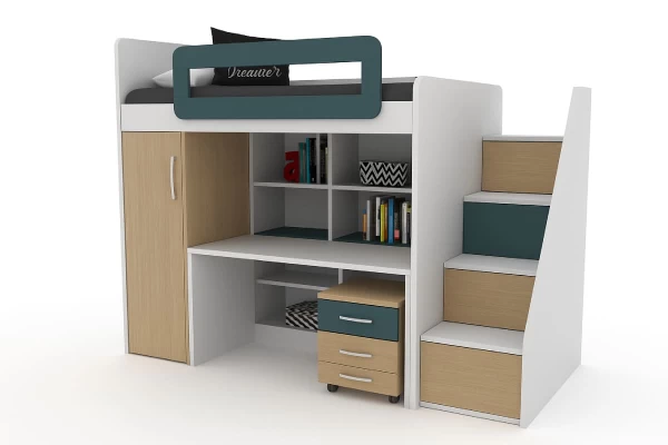 Η ψηλή κουκέτα για το εφηβικό δωμάτιο, που χαρακτηρίζεται από εξαιρετική σταθερότητα και ποιότητα. Πλούσιοι αποθηκευτικοί χώροι στη ντουλάπα , στη βιβλιοθήκη αλλά και στα σκαλοπάτια. Πρόκειται για μια λύση που θα λατρέψει κάθε έφηβος.