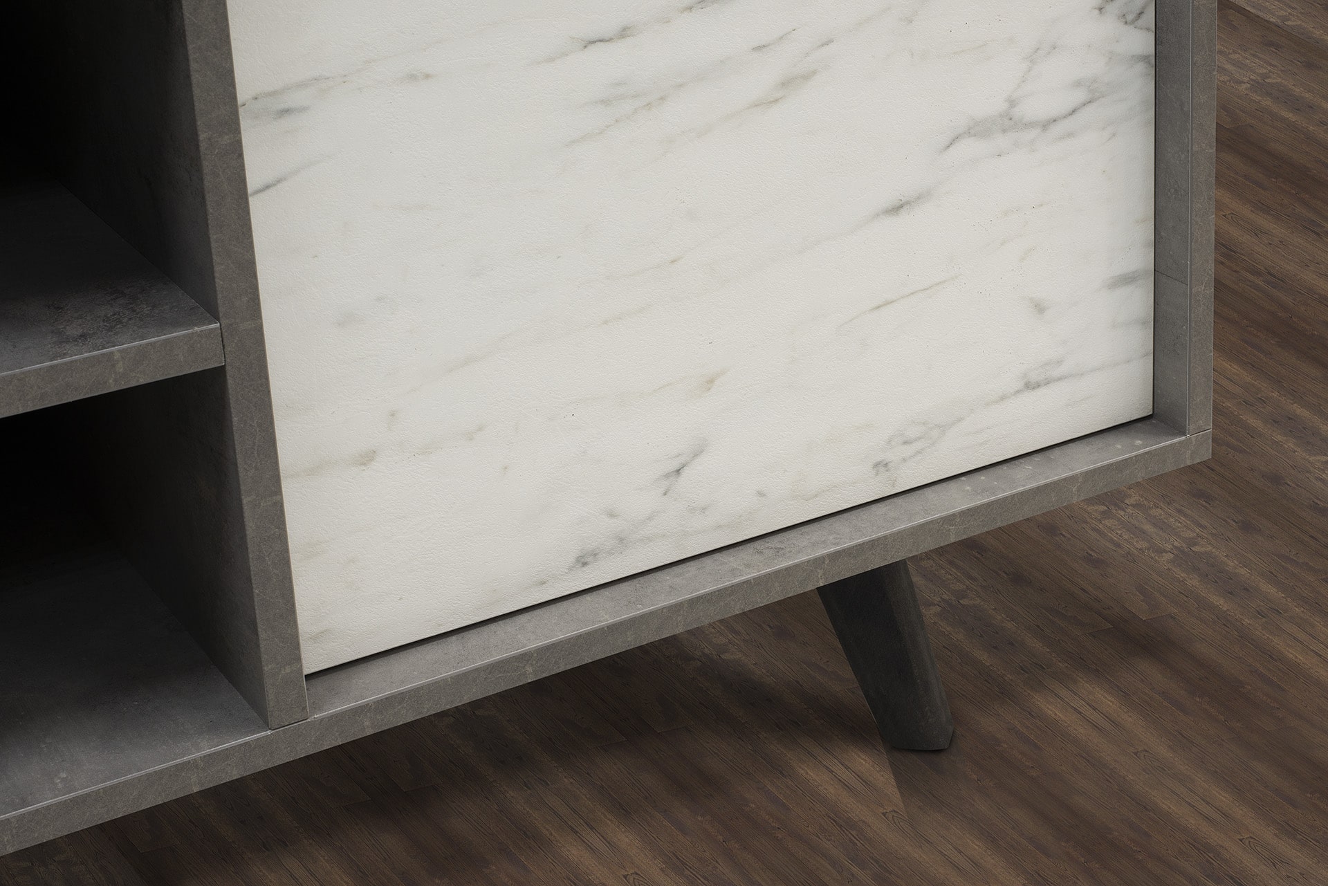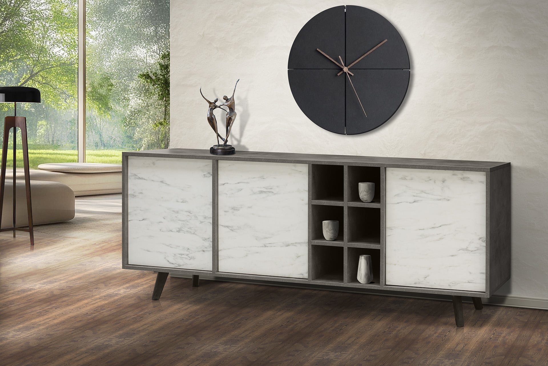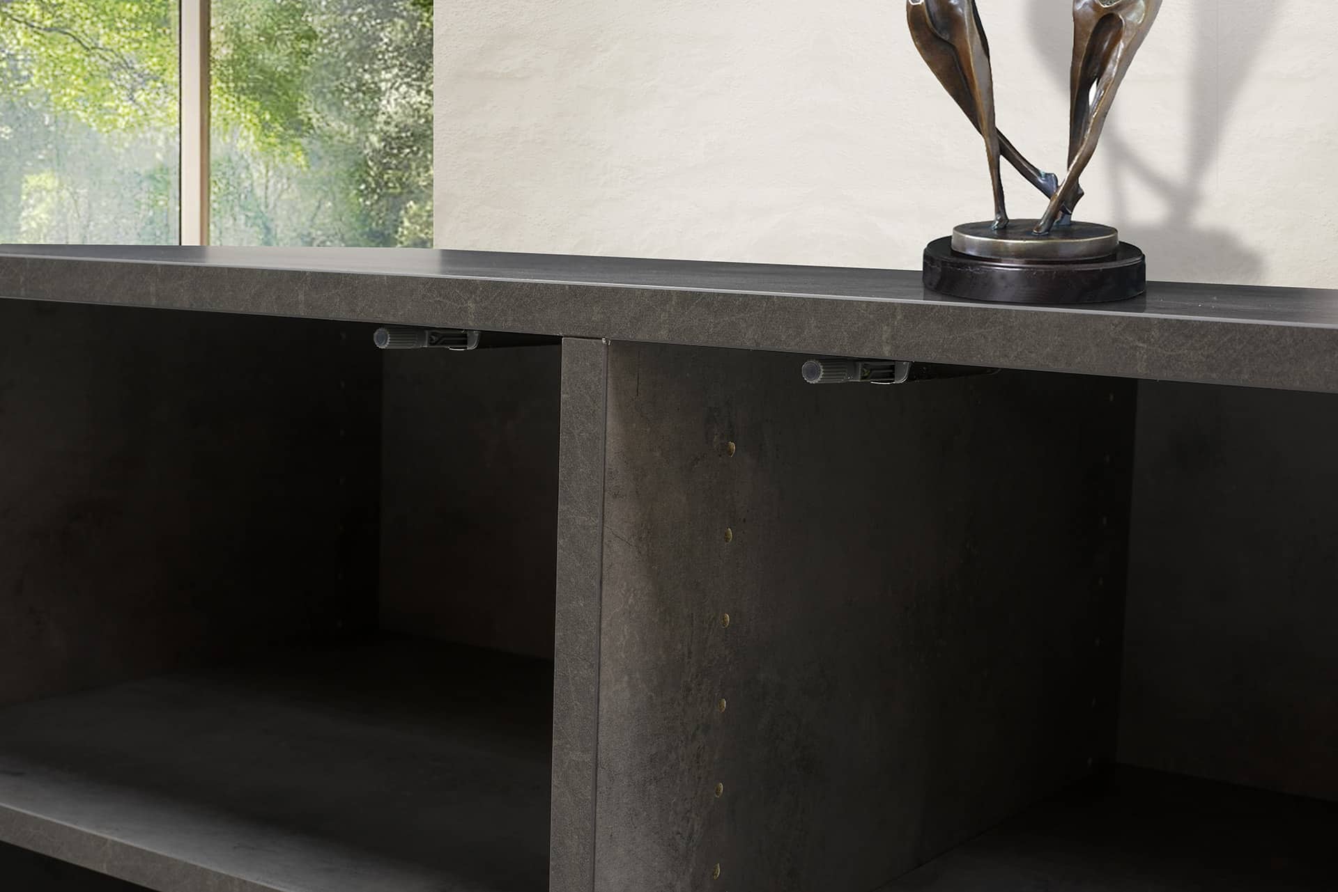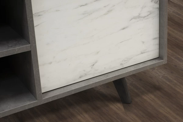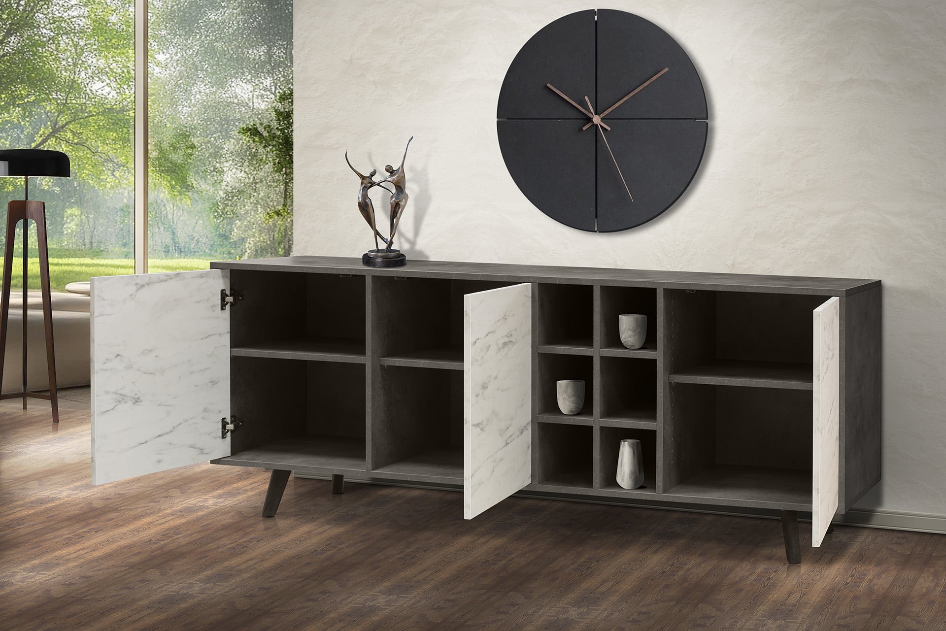 O μπουφές FOCUS έχει τρεις πόρτες με άνοιγμα push, οι οποίες στο εσωτερικό τους έχουν από ένα ράφι. Χαρακτηριστικό του η ενσωματωμένη ραφιέρα.