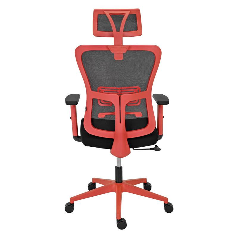 Η πλάτη της καρέκλας είναι κατασκευασμένη από ανθεκτικό πλέγμα (mesh), το οποίο επιτρέπει την καλή κυκλοφορία του αέρα. Με αυτόν τον τρόπο αποφεύγεται η συσσώρευση θερμότητας και υγρασίας στην περιοχή της πλάτης, διατηρώντας τον χρήστη δροσερό και άνετο ακόμη και μετά από πολλές ώρες καθιστικής εργασίας. Το κάθισμα είναι επενδυμένο με ύφασμα υψηλής αντοχής, προσφέροντας ευχάριστη αίσθηση, ανθεκτικότητα στη χρήση και σωστή υποστήριξη.