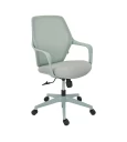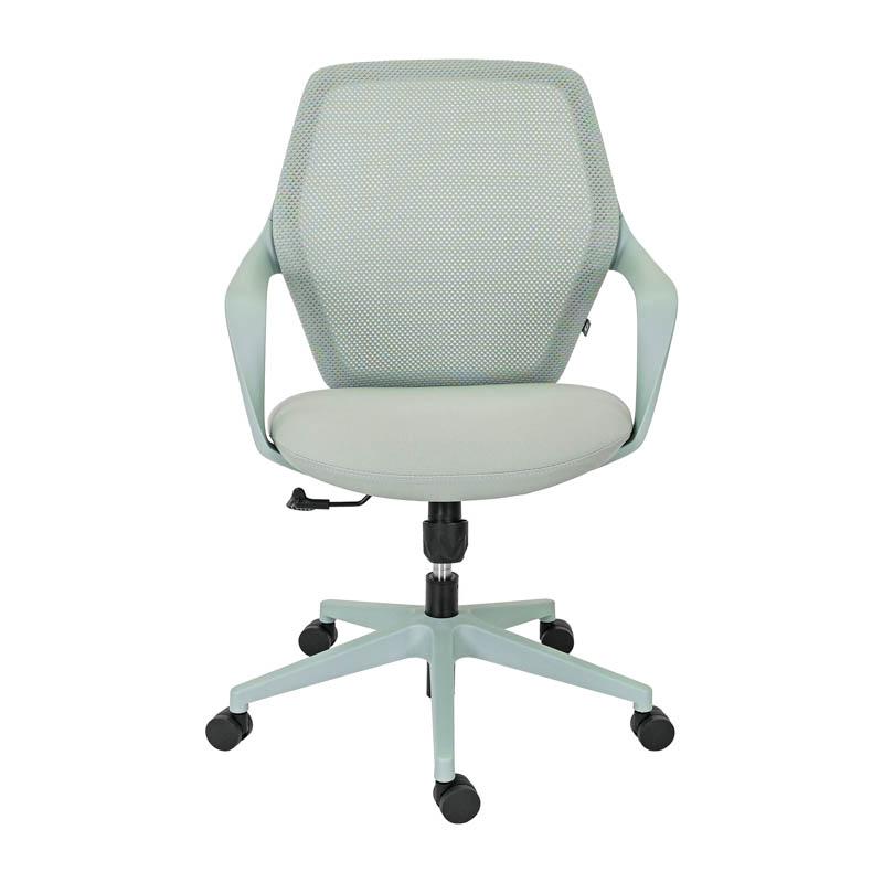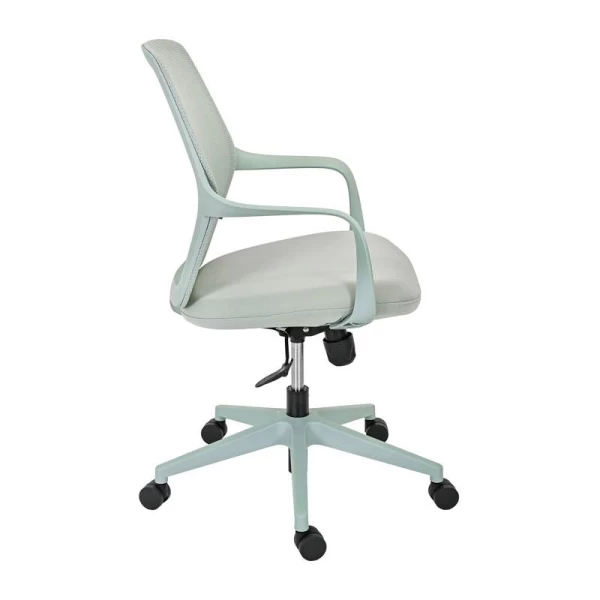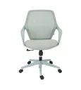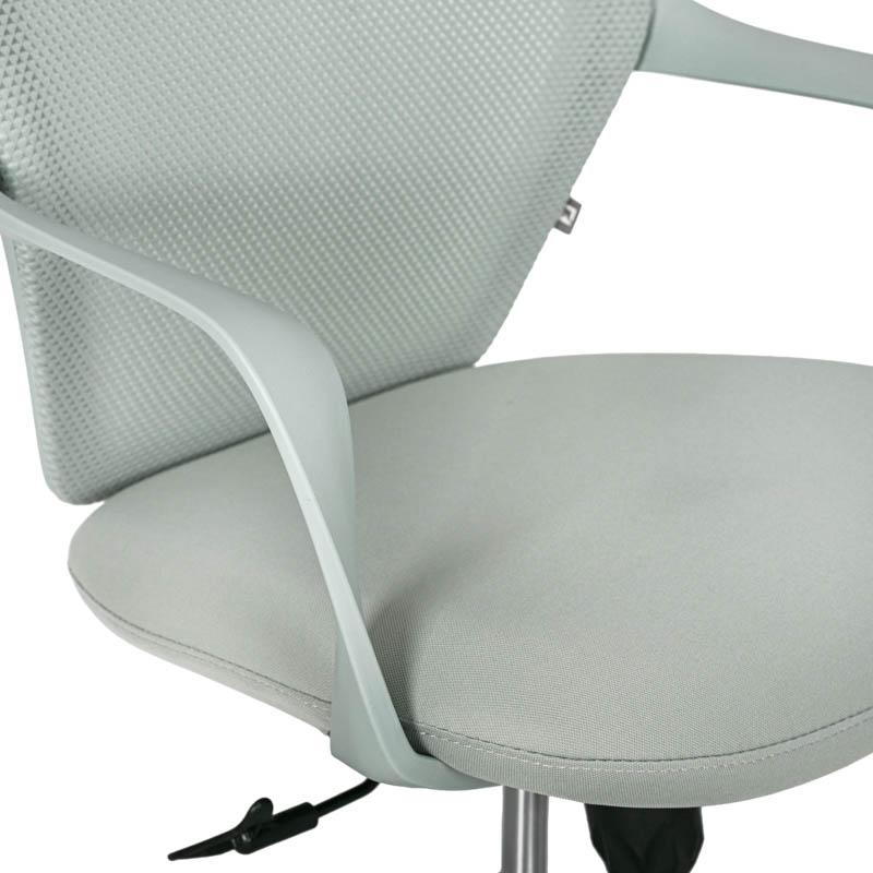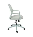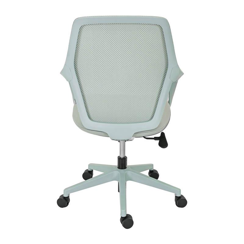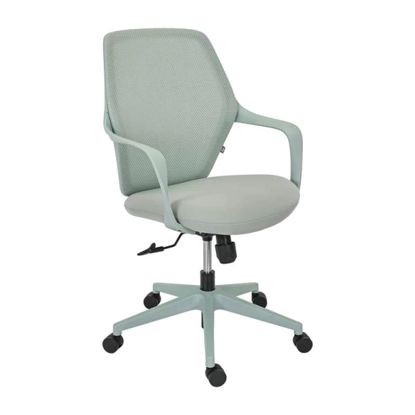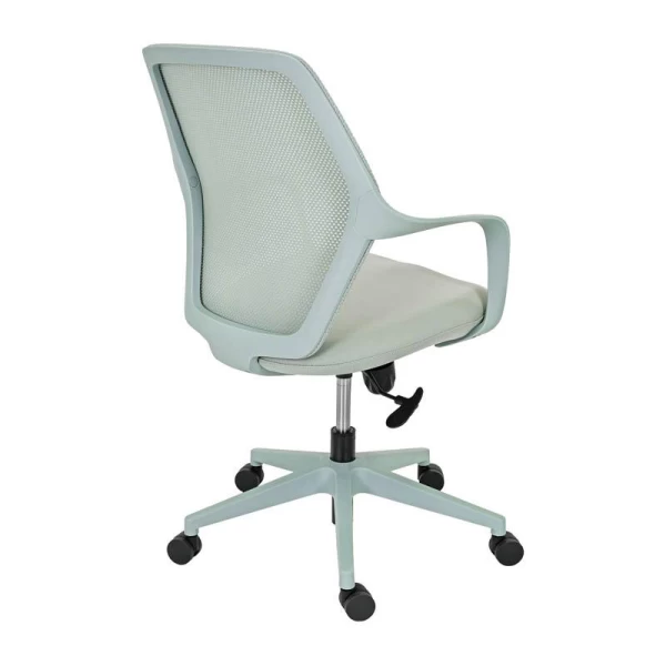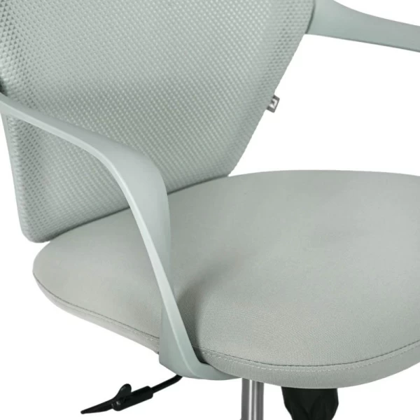 Η πλάτη της καρέκλας είναι κατασκευασμένη από ανθεκτικό πλέγμα (mesh), το οποίο επιτρέπει τη σωστή κυκλοφορία του αέρα. Η διαπνέουσα αυτή κατασκευή συμβάλλει στη διατήρηση μιας δροσερής και ευχάριστης αίσθησης στην περιοχή της πλάτης, ακόμη και μετά από πολλές ώρες εργασίας. Παράλληλα, το κάθισμα είναι επενδυμένο με ύφασμα υψηλής αντοχής, προσφέροντας άνεση και σταθερότητα κατά την καθημερινή χρήση, ενώ διατηρεί την ποιότητά του στον χρόνο.