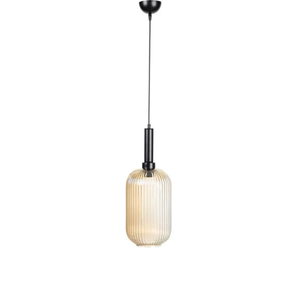 Μοντέρνο φωτιστικό οροφής με κομψή, κυλινδρική γυάλινη απόχρωση σε χρώμα φιμέ. Ο ραβδωτός σχεδιασμός του γυαλιού δημιουργεί μοναδικές αντανακλάσεις φωτός και αναβαθμίζει κάθε εσωτερικό χώρο με στυλ και χαρακτήρα. Συνδυάζει κομψότητα και λειτουργικότητα, ιδανικό για μοντέρνα και industrial διακόσμηση.