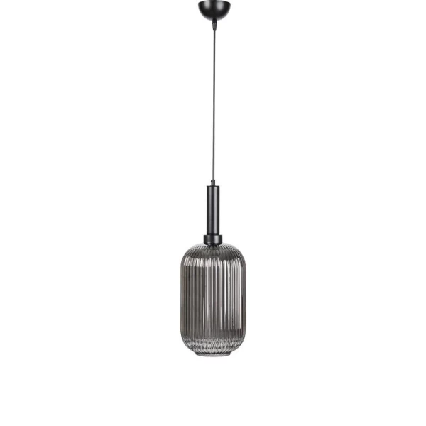 Μοντέρνο φωτιστικό οροφής με κομψή, κυλινδρική γυάλινη απόχρωση σε χρώμα φιμέ. Ο ραβδωτός σχεδιασμός του γυαλιού δημιουργεί μοναδικές αντανακλάσεις φωτός και αναβαθμίζει κάθε εσωτερικό χώρο με στυλ και χαρακτήρα. Συνδυάζει κομψότητα και λειτουργικότητα, ιδανικό για μοντέρνα και industrial διακόσμηση.