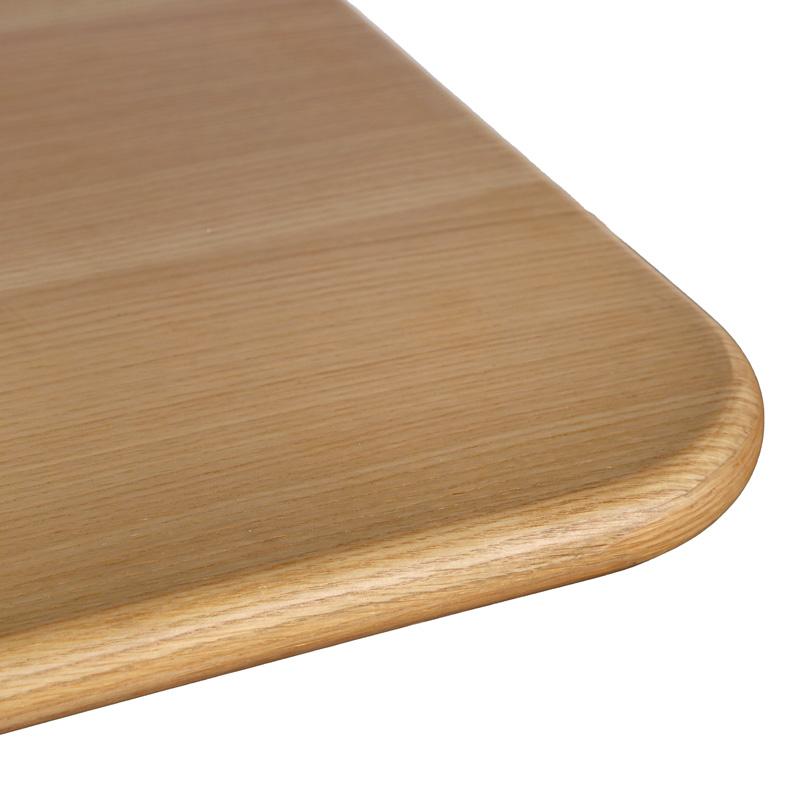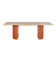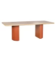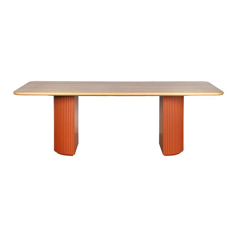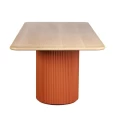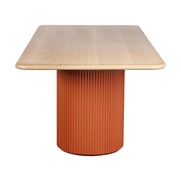 Η επιφάνεια της τραπεζαρίας είναι οβάλ, προσφέροντας απαλές γραμμές που διευκολύνουν τη ροή στον χώρο και ενισχύουν την αίσθηση άνεσης. Η κυλινδρική ξύλινη βάση με πηχάκια δημιουργεί μια ενδιαφέρουσα οπτική και συμβάλλει στην σταθερότητα του τραπεζιού. Τα πηχάκια στην επιφάνεια της βάσης προσδίδουν μια ρετρό αλλά μοντέρνα αισθητική, ενώ επιτρέπουν το φως να παίζει με τις σκιές, δημιουργώντας μια ενδιαφέρουσα υφή.