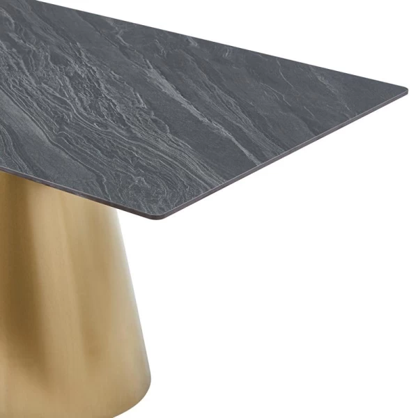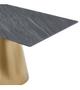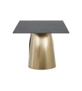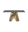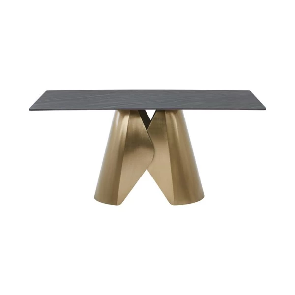 Ένα κομψό και μοντέρνο τραπέζι τραπεζαρίας που συνδυάζει πολυτέλεια με λειτουργικότητα. Με επιφάνεια από κεραμικό υλικό πάχους 12mm και καμπύλα μεταλλικά πόδια σε απόχρωση brushed gold, αυτό το τραπέζι προσδίδει μοναδική αισθητική σε κάθε χώρο. Ιδανικό για καθημερινή χρήση αλλά και για επίσημα γεύματα, προσφέρει σταθερότητα, αντοχή και εύκολη συντήρηση.